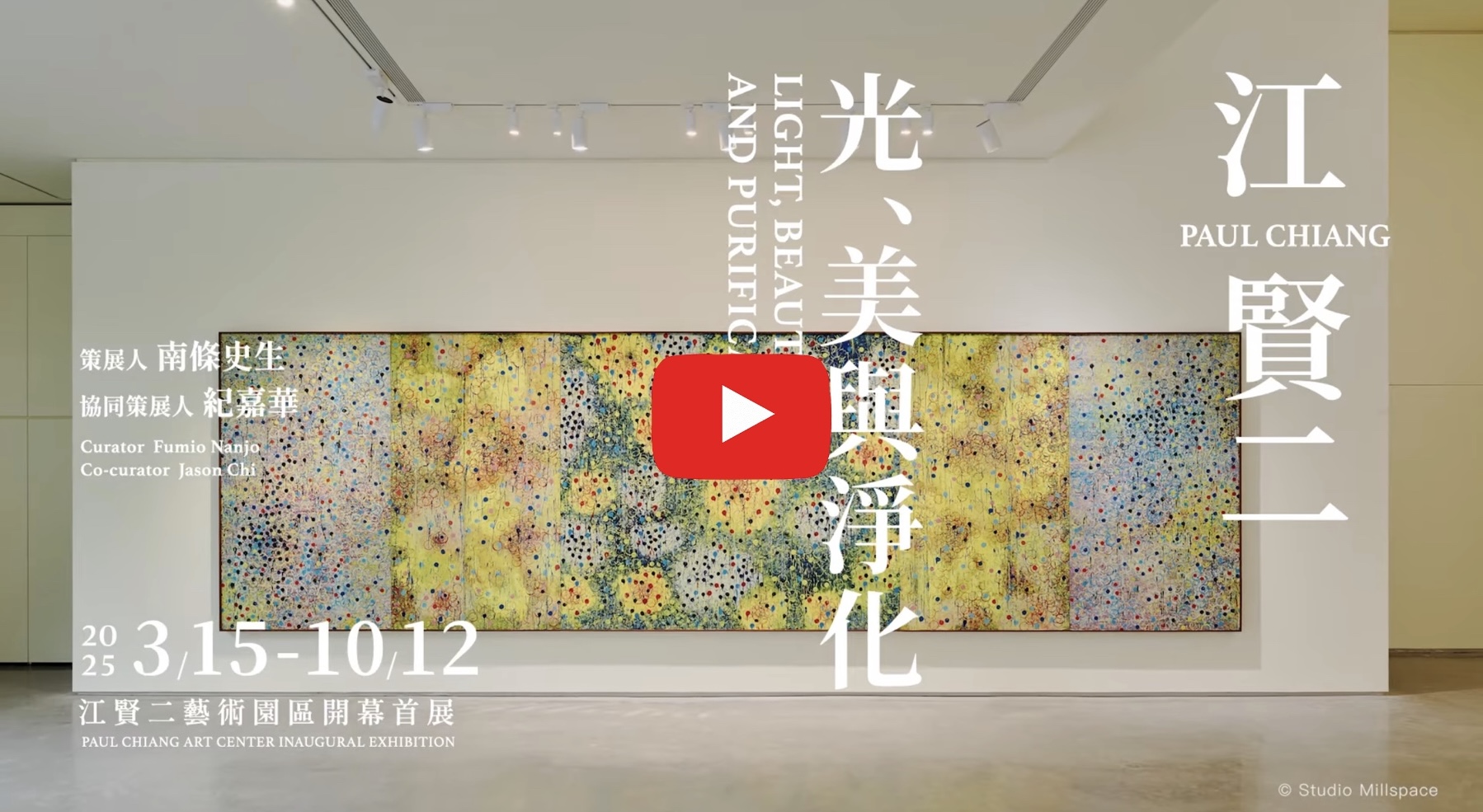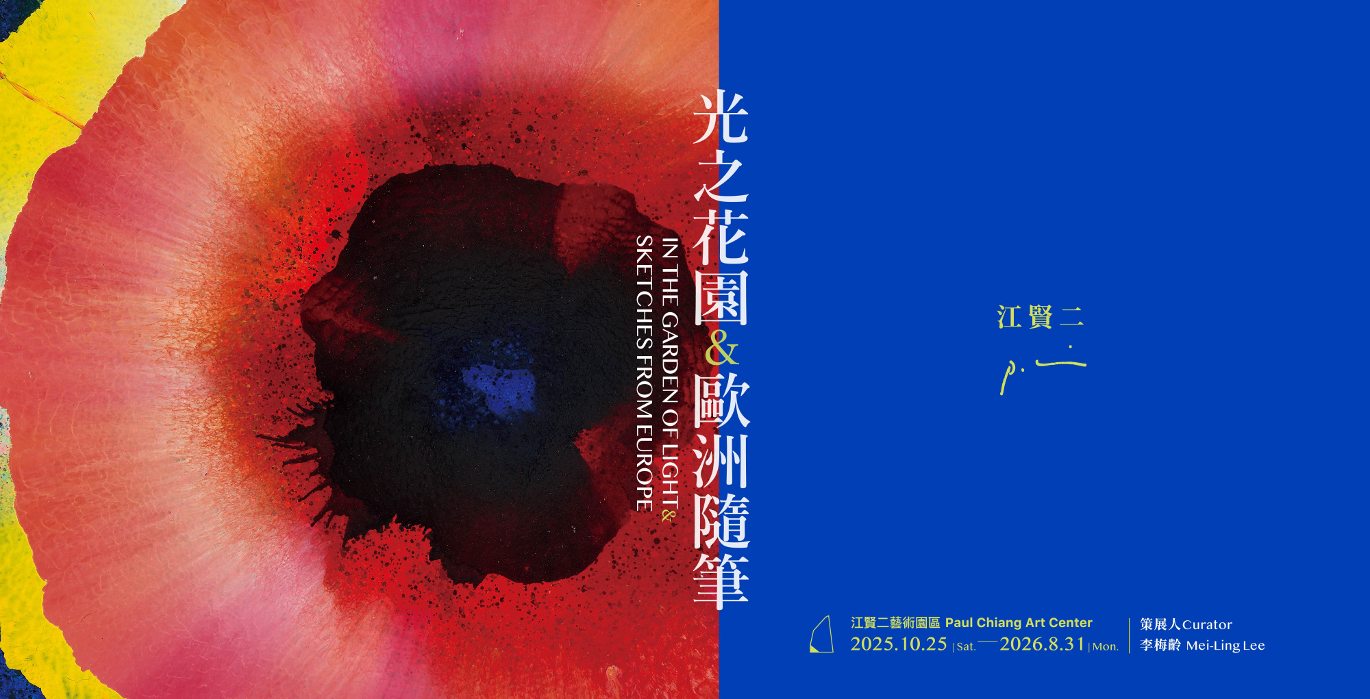 今年秋天,江賢二將歐洲的光與色,帶回到園區。他前往法國巴黎及葡萄牙里斯本;里斯本是他形容為「光線清脆明亮」的城市——完成了形式自由的《歐洲隨筆》系列;而《光之花園》系列則延續自然的能量與生命的律動,本次展覽展出超過百件新作,綻放出繪畫的自由與爆發力。