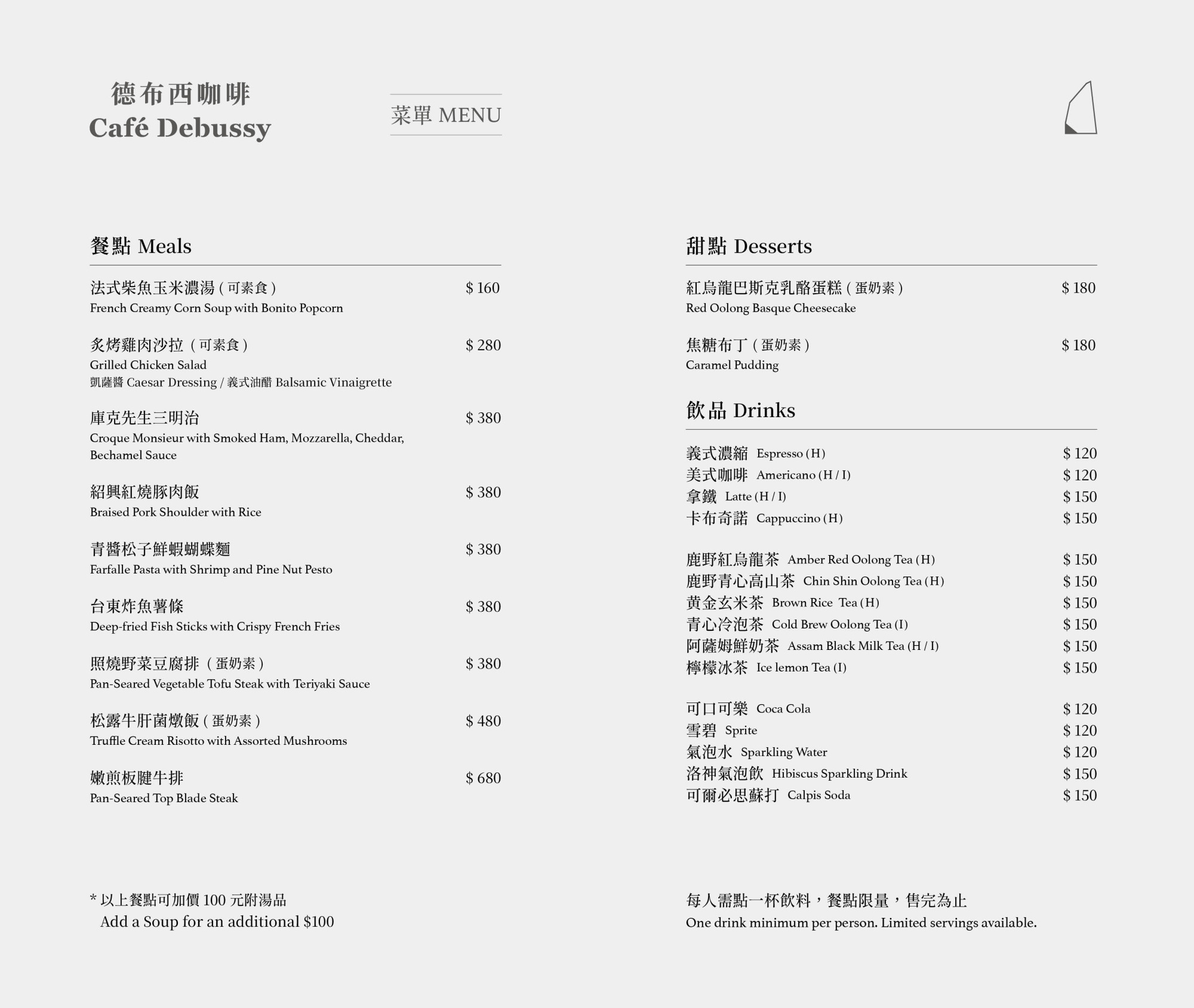 - We invite each guest to order at least one drink. Please note that food offerings may be limited.