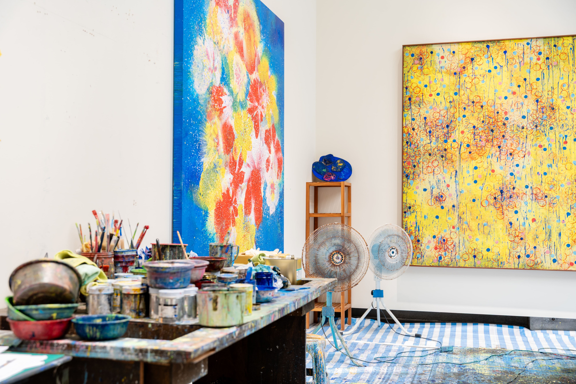 園區開幕之後,江賢二的畫室轉而作為展覽空間,他臨時搭建了一個簡單的小畫室,兩三坪的小地方,甚至連「空間」都算不上。畫室因陋就簡,但創作卻不因此停止。此刻的他,心境可能隨著園區落成而稍稍放緩,春天來臨、雖然偶有冷風但已經日漸有暖意。流動的空氣中可以感受到微風帶來台東的生命力,他筆下也隨著出現亮黃、青綠、嫩紅、寶藍,晶亮透明而盈滿了春天乍現的光之盛宴。