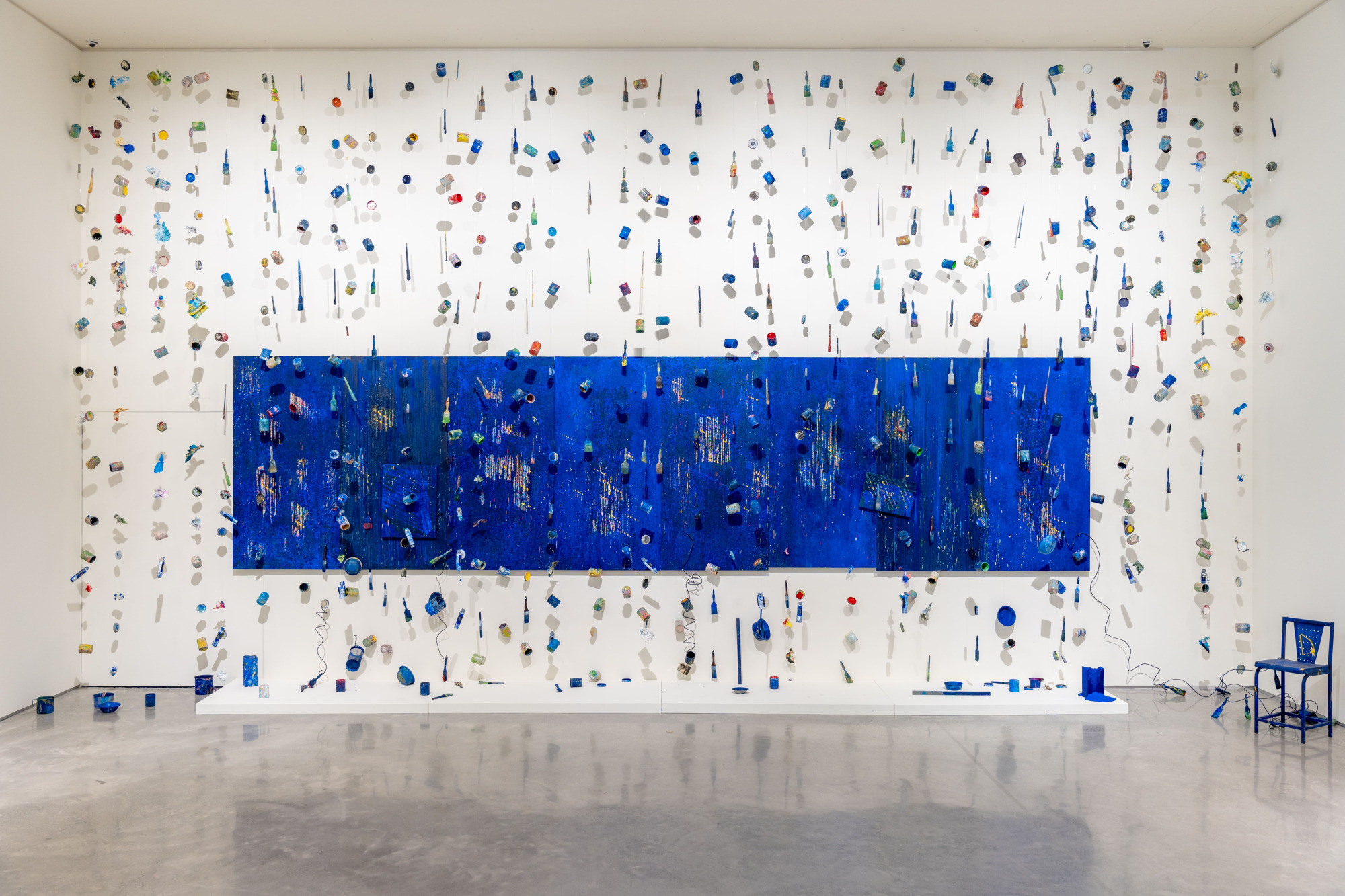 《光之花園》系列其中一幅作品〈光之花園25-80〉,靈感來自園區清晨,陽光透過黃椰子樹葉細縫灑落而下的意象。江賢二在模板上創作出一片台東的深藍色,畫作周圍佈置著他創作時不可缺少的筆刷、顏料罐、沾滿了顏料的工具等等,以細線懸吊從天而降般,在畫作表面留下深深淺淺的影子。這樣的佈局又增加了一層觀賞作品的樂趣,也彷彿是江賢二台東生活的「寫生」。