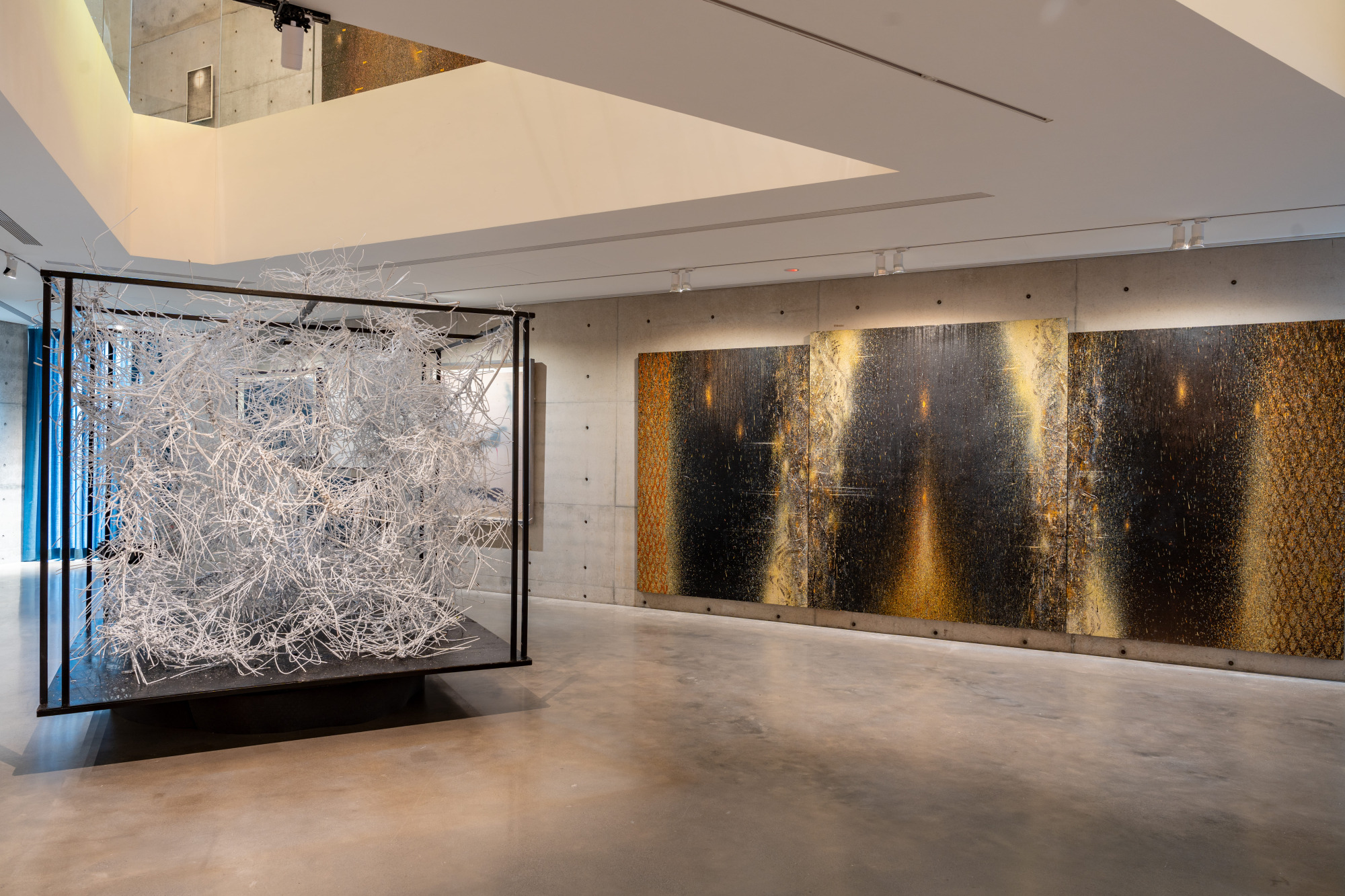 2020年3月底,台北市立美術館舉辦了「江賢二:回顧展」,當時最後一個展間展出了動態雕塑作品〈金樽/淨化之夜〉,兩公尺見方的正方體構架內,纏繞萬千難解的白色鐵絲,搭配馬勒〈第五號交響曲〉第四樂章的極慢版,在燈光調暗的靜謐空間中,彷彿有生命一般,發光恆動緩緩自轉。這件作品在新展中將坐鎮承翰館(第三展廳),在挑高兩層樓的空間中,伴隨馬勒的音樂,似乎更加接近江賢二內心深處的精神空間。