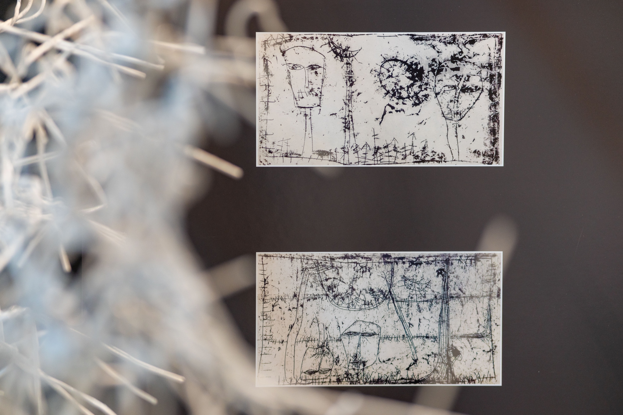 一同在承翰館展出的,還包括江賢二在人生第一次個展中的作品〈尋〉、〈茫〉,藉由這兩件作品,回望他年輕時創作生命的苦澀和窒息感。同樣鐵絲的意象,但是年少時的作品將釘痕與縫線狠狠纏繞在人臉上,現在則是成為永恆自轉的恆星一般,沐浴在溫暖的台東陽光和神聖的音樂中,彷彿用作品寬慰自己年輕時被禁錮的心靈。