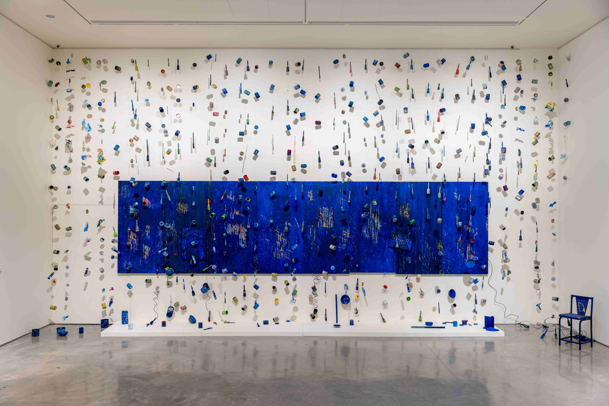抽象畫的美,就是每個人都能有自己的詮釋。譬如這幅畫,對我來說,它畫的就是老師的生活。老師很喜歡把生活當成創作的題材。上一檔展覽,這裡掛的是老師創作的〈金樽/詩情畫意〉,可以感受到他在空間中作畫的那種期待與心情。你看那些瓶子、那些顏料,其實都是老師每天生活的一部分,是他日常的片刻。除了這麼多新的作品,我們也發現老師這幾年開始重新回顧過去的主題。