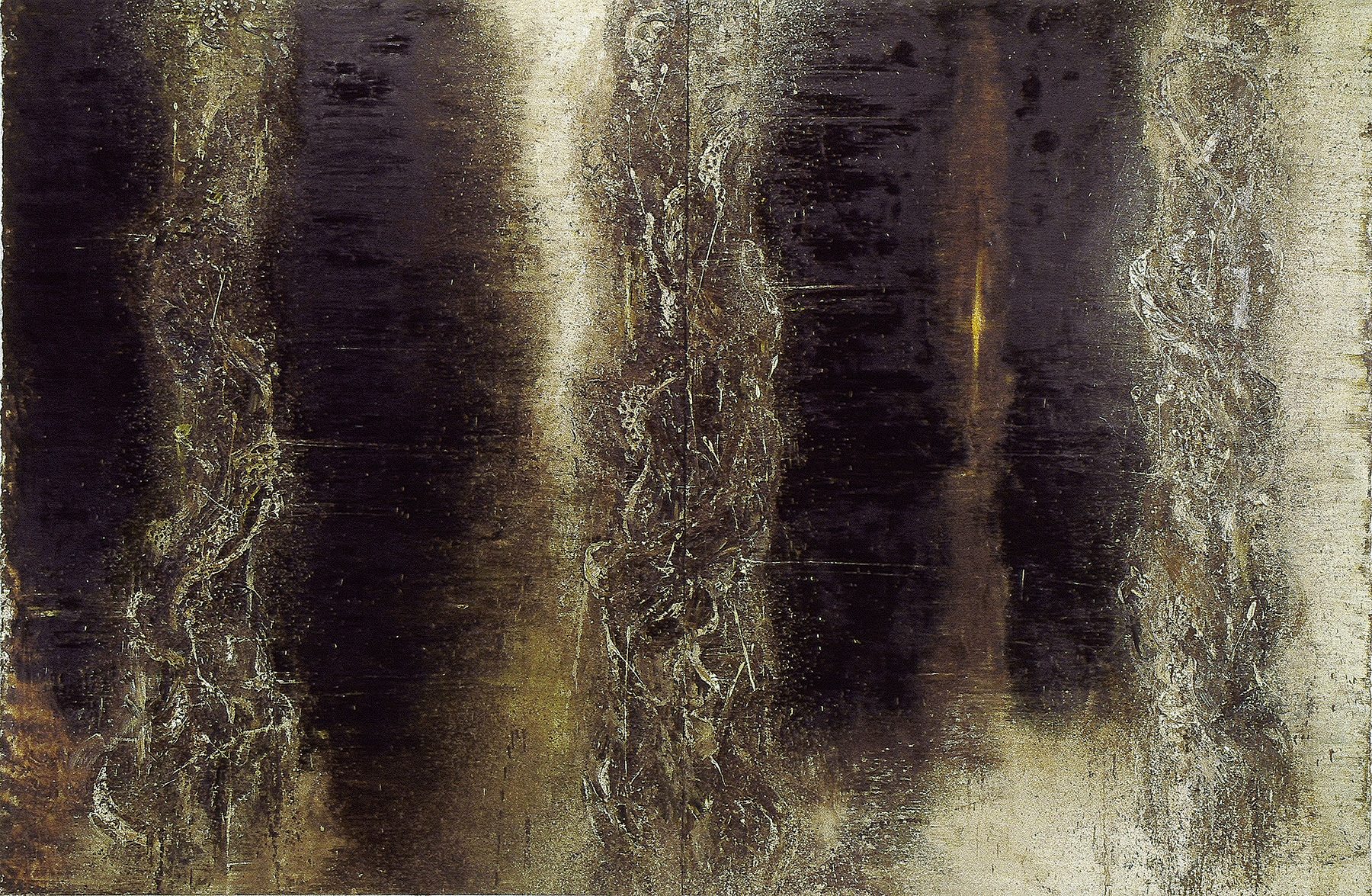 江老師的創作,正是一種在藝術中不斷追求創新、尋找新的表現方式的思維。這點很像趙無極先生,他晚年有一段時間也用瀝青潑灑在畫布上,再上色、堆疊出新的肌理。如果大家仔細看這一間展廳(2-2展廳),不論在技法、構圖,或藝術語彙上,老師想要傳遞的訊息其實非常多。這種「多層次」的語言,又呼應我們一開始講的——整個園區的存在本身,就是一個「進行式」。