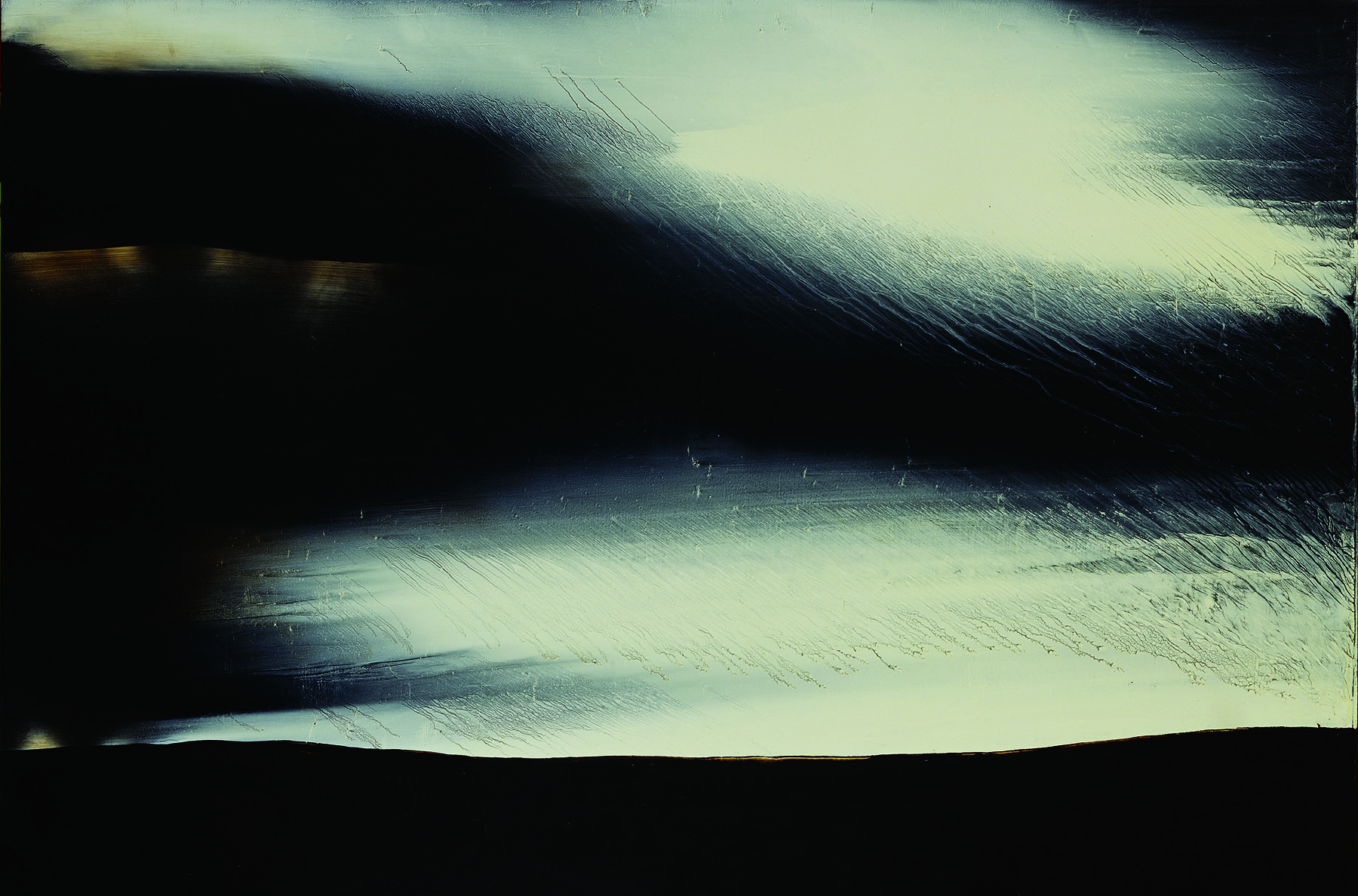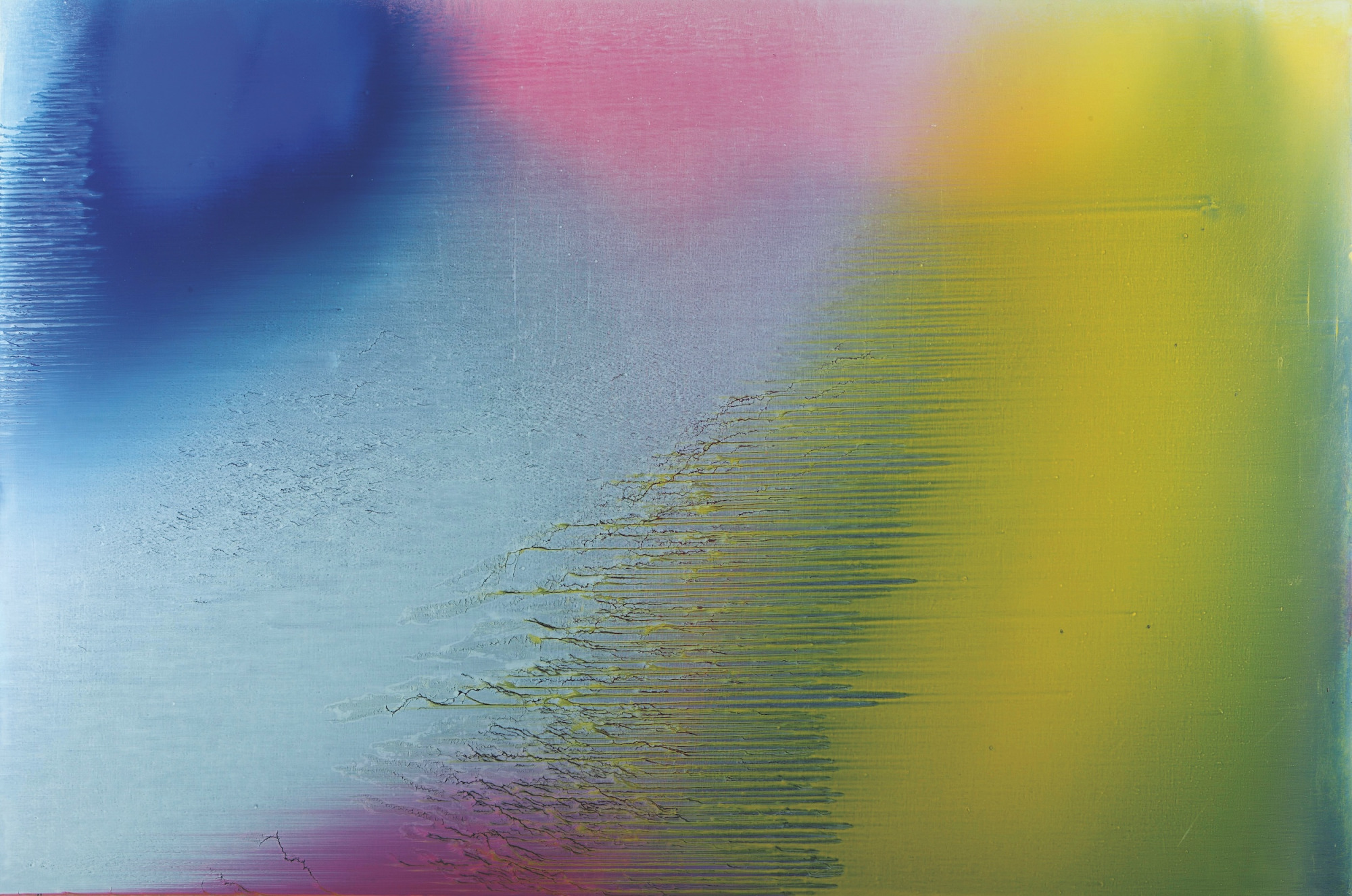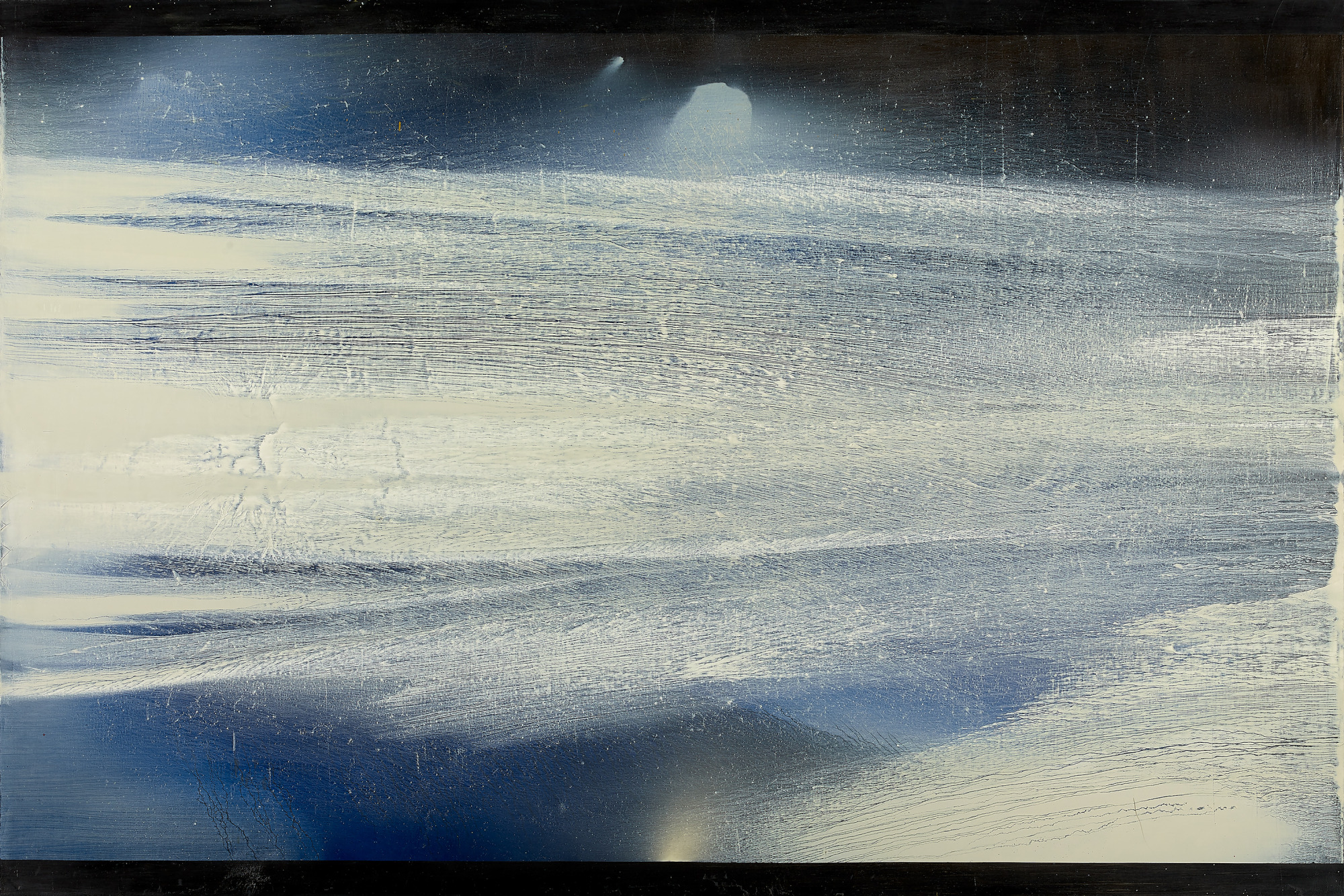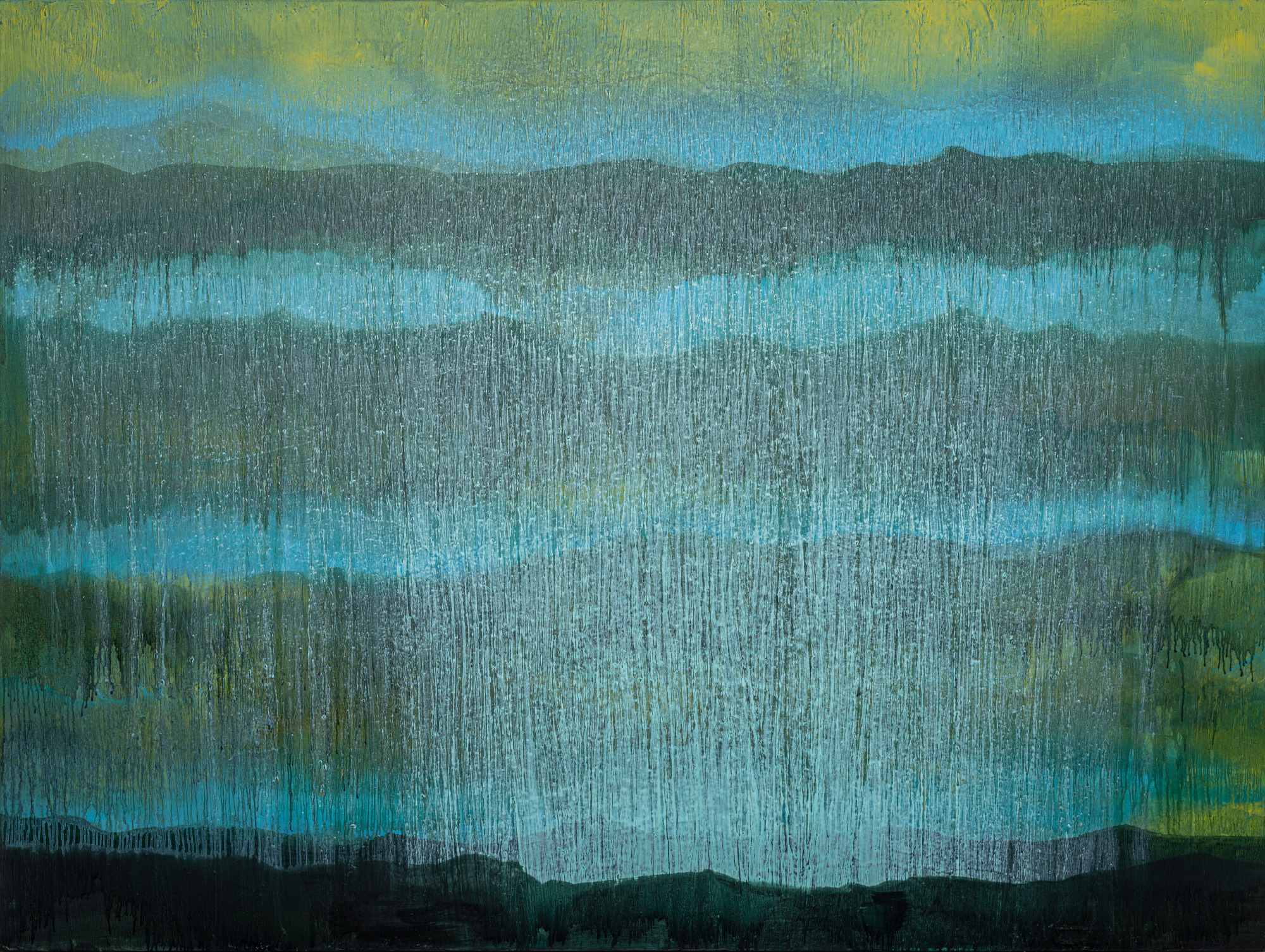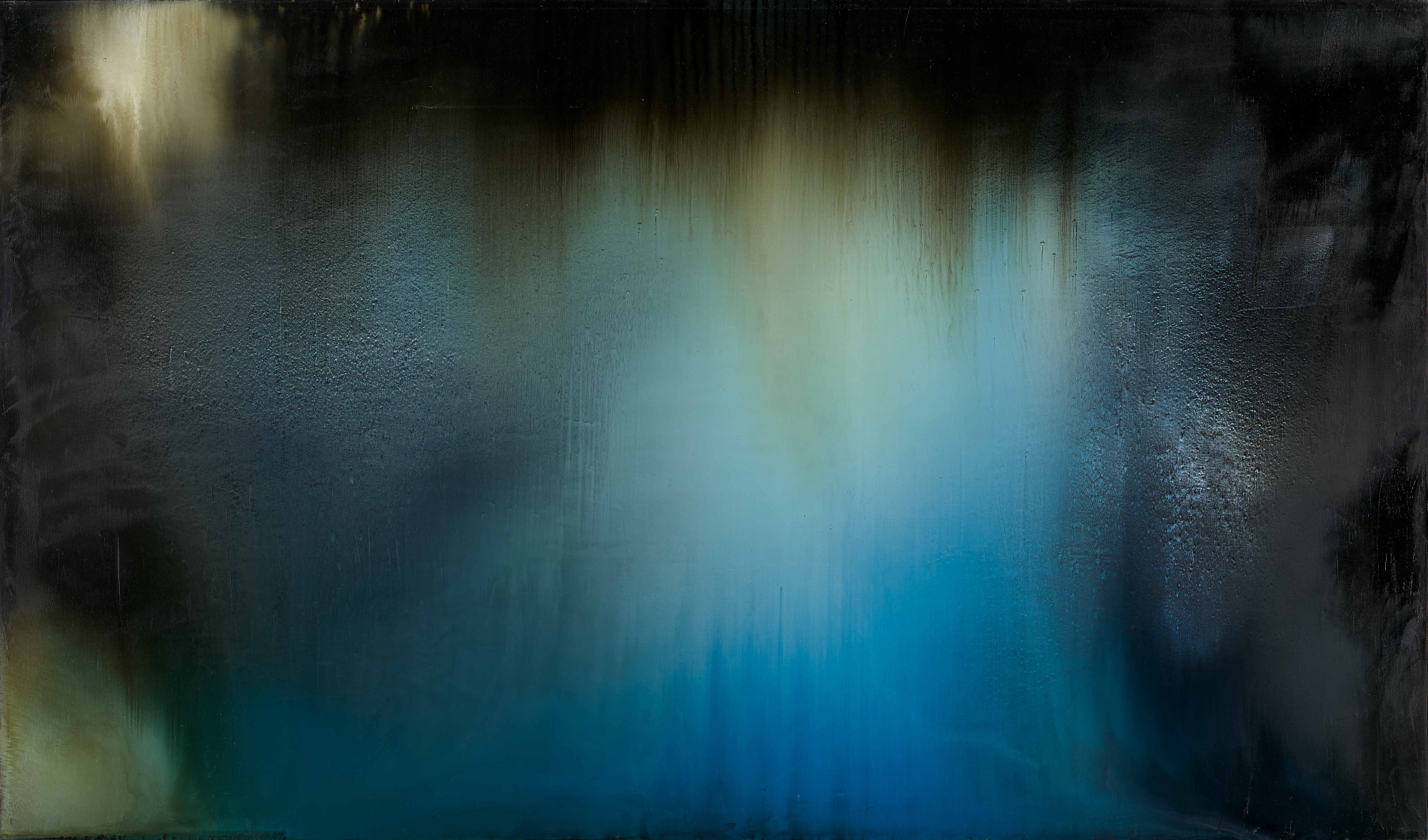 68歲|這是江賢二個人極為喜歡的作品。畫面正中央及左上角的橫向流痕都是創作過程中自然衍生的,曖昧的淡藍與淡黃透出亮光,呈現一種清明之氣,雋永諧和。