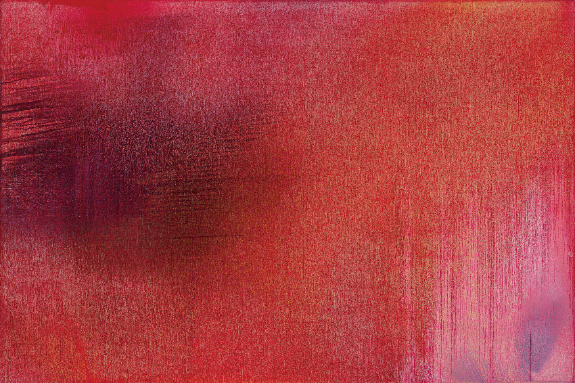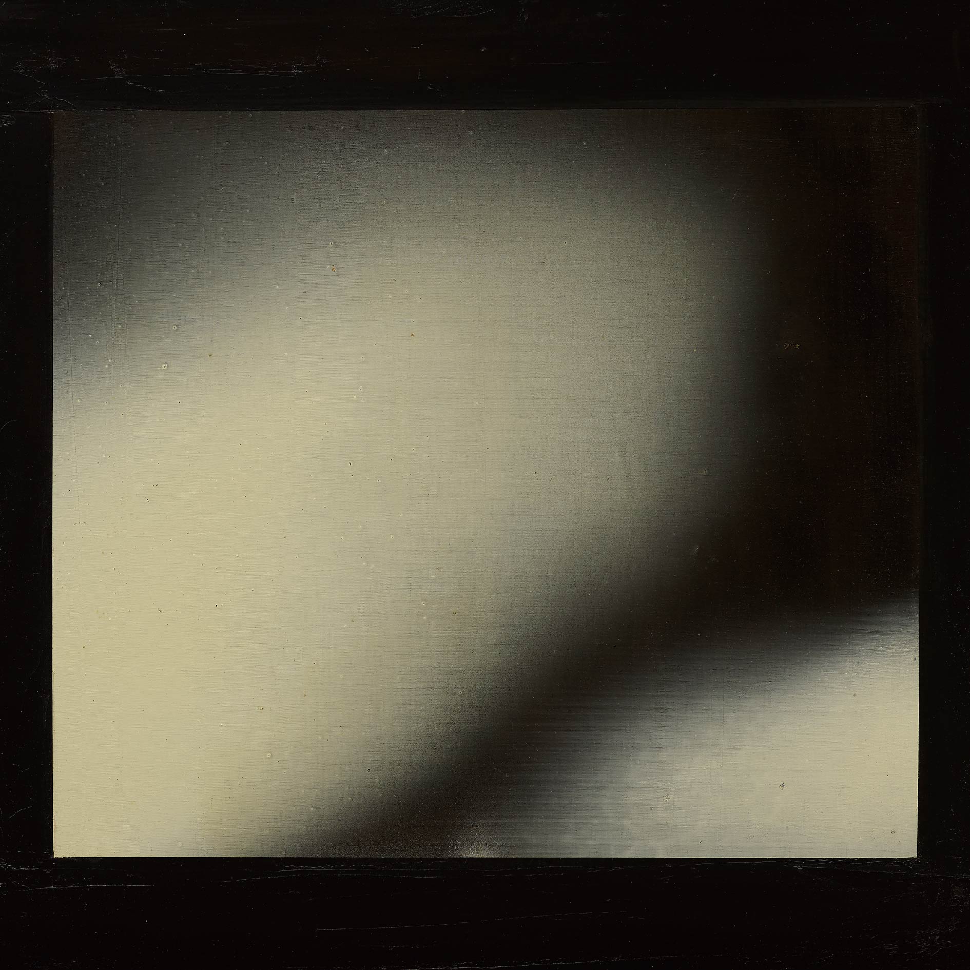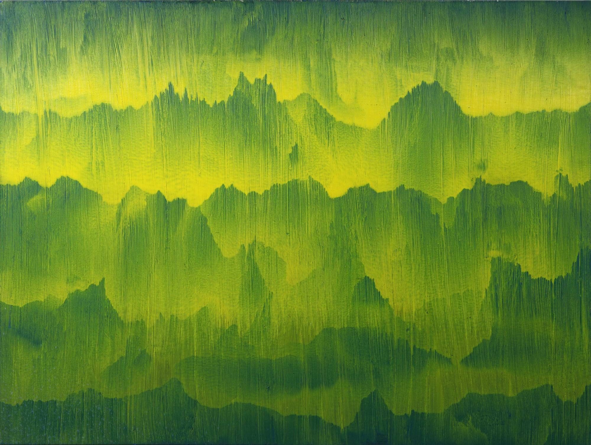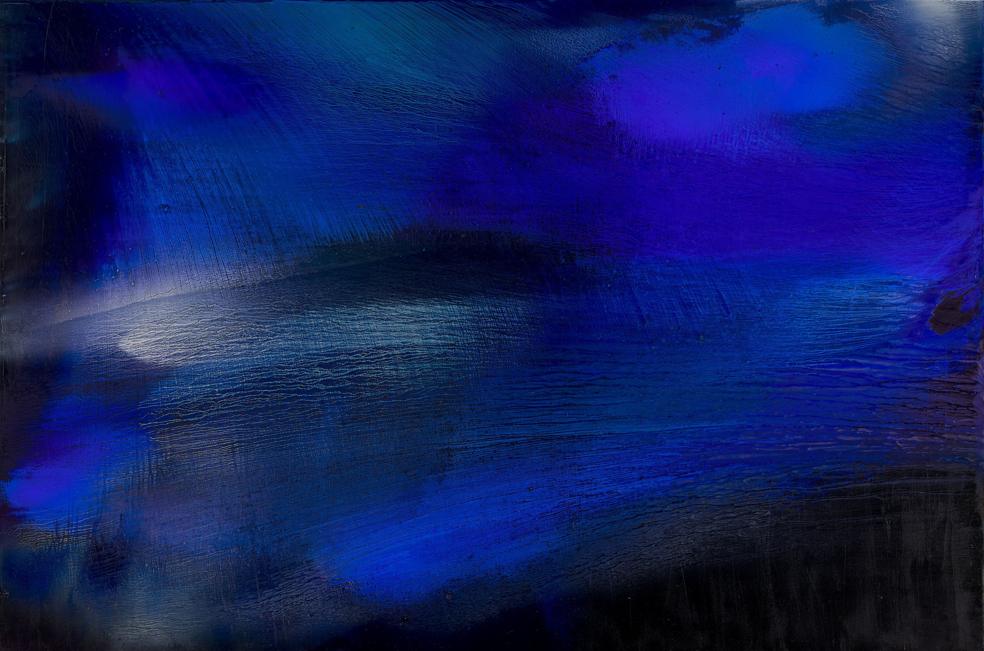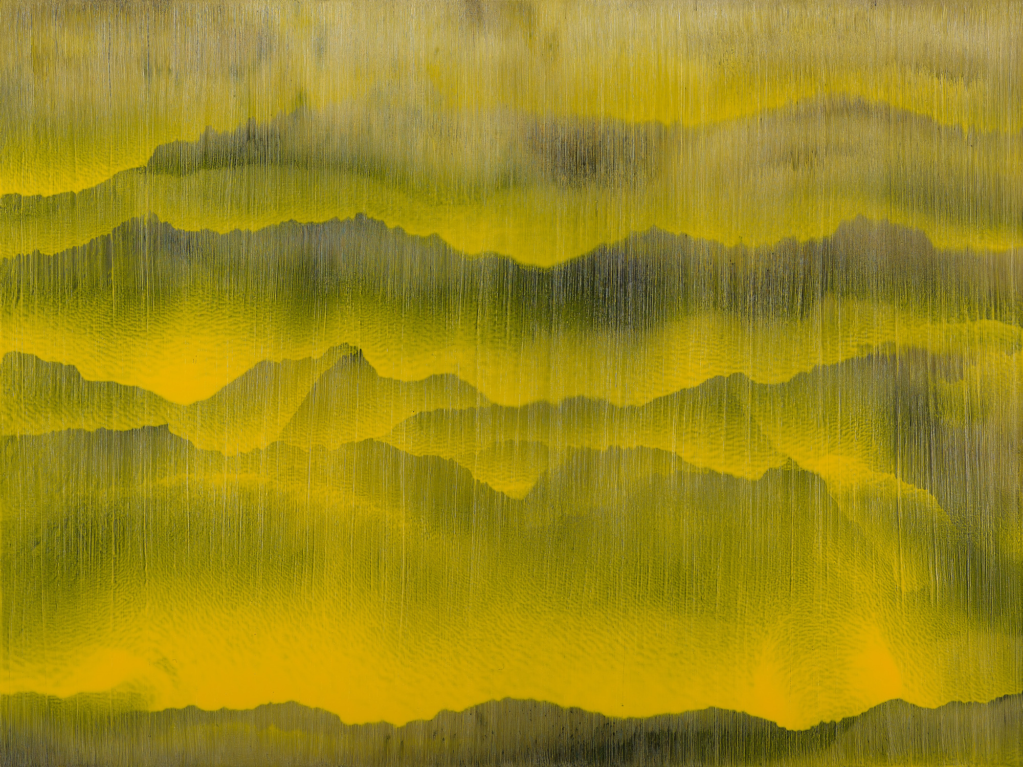 68歲|這是江賢二個人極為喜歡的作品。畫面正中央及左上角的橫向流痕都是創作過程中自然衍生的,曖昧的淡藍與淡黃透出亮光,呈現一種清明之氣,雋永諧和。