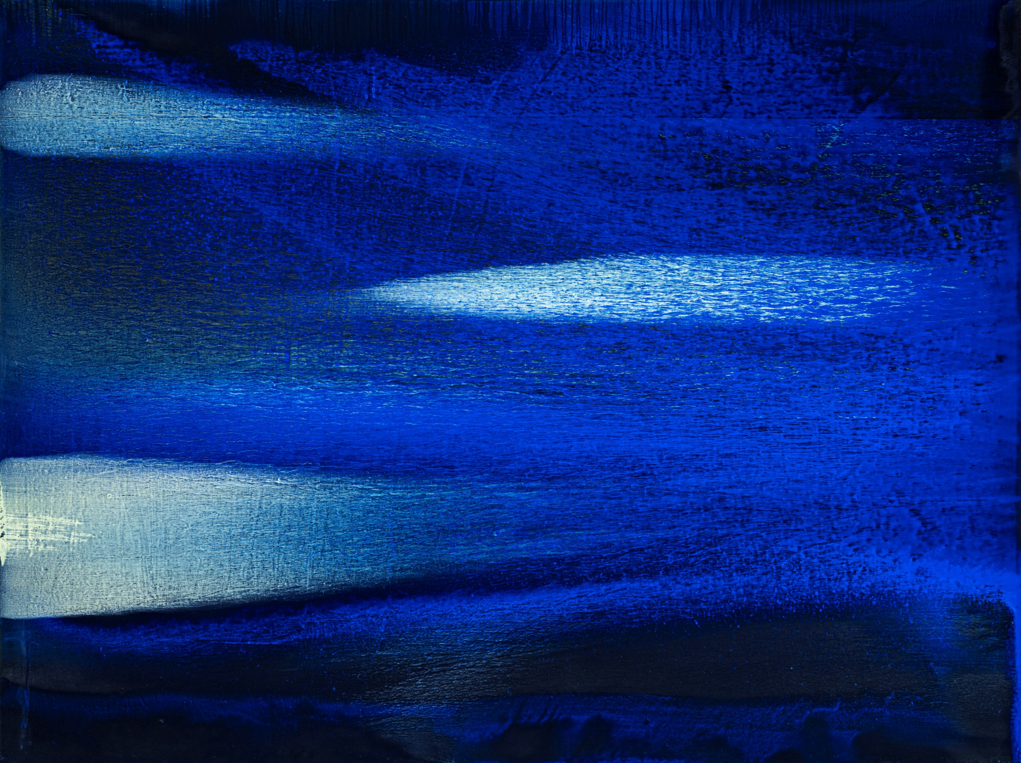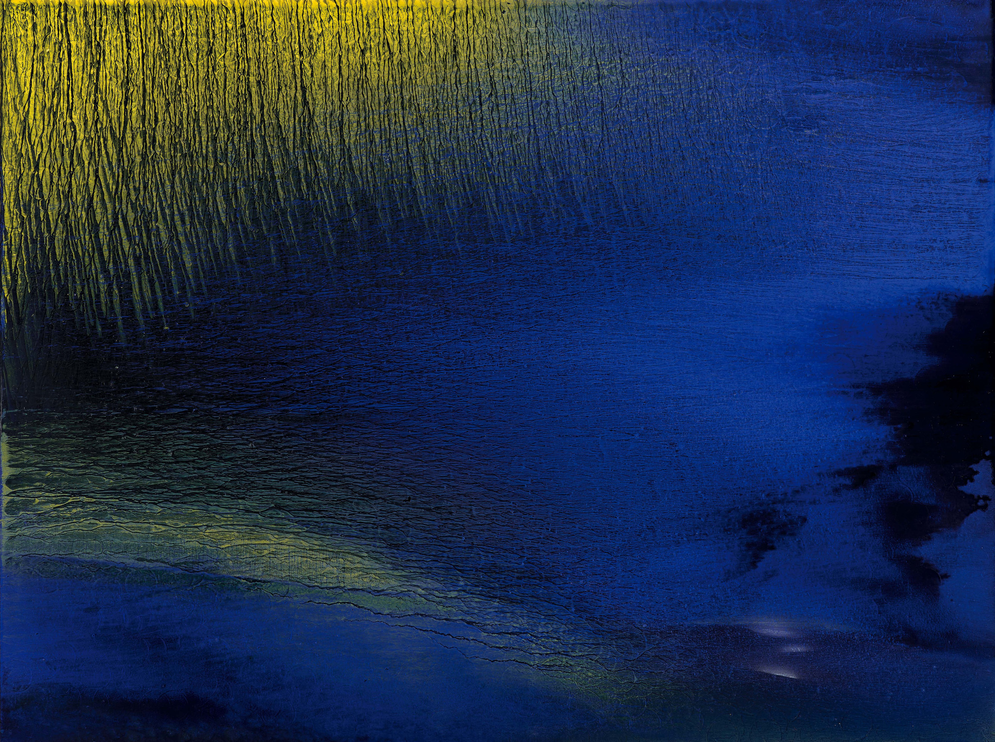 73歲|夜幕低垂,台東的月光靜靜落在水面上,映照出寧靜而深邃的倒影。江賢二讓色彩記錄月光進入夜的瞬間,深藍與金色交織,捕捉月光、水面與時間之間安詳而永恆的呼吸。