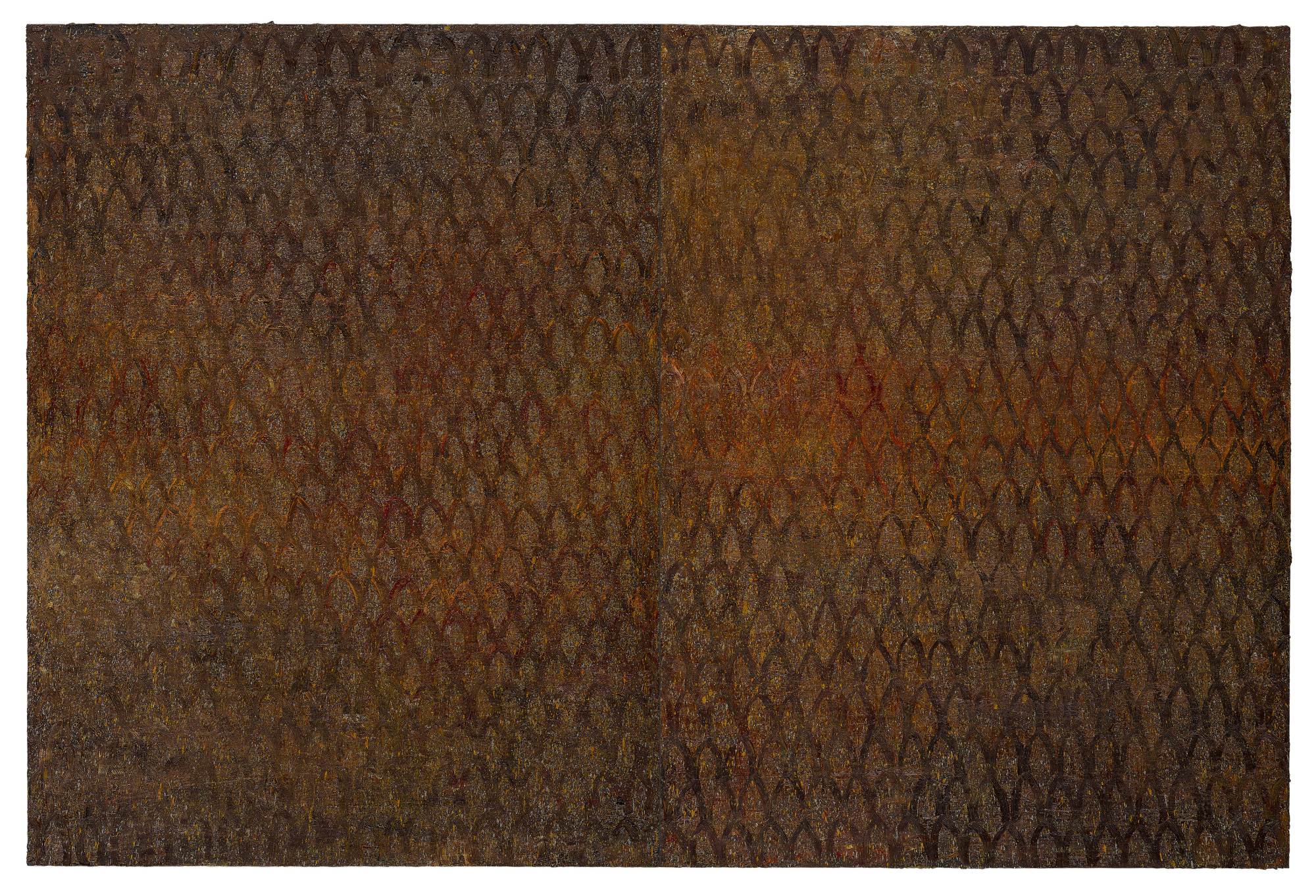 56歲|剛回到台灣,雖然工作室簡陋,並沒有削弱江賢二日以繼夜創作的熱情。這些作品承載他層層堆疊的記憶、信仰與歸屬感,畫面中金銅色的光象徵著溫暖而不熄的永恆之光。
