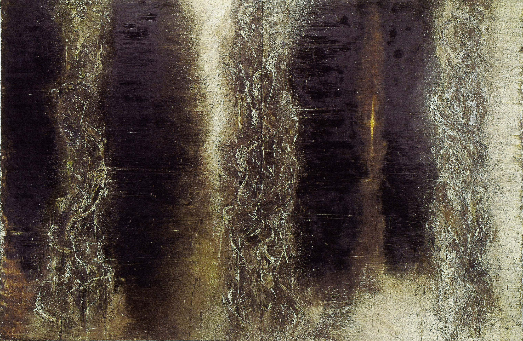 55歲|畫面兩側厚重堆疊的筆觸,彷彿一根根通天的龍柱。中央細小而溫暖的光點,是陪伴人、給人力量的光。他以過去30年在異國淬鍊的純熟技巧,畫出東方溫暖的感覺。